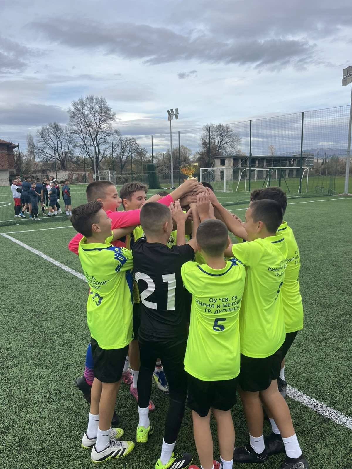 Отборът на ОУ “Св. св. Кирил и Методий“ – Дупница триумфира в Общинския кръг на ученическите игри по футбол при възрастовата група 5–7 клас. На финала младите таланти постигнаха убедителна победа с 3:0 над състава на СЕУ “Св. Паисий Хилендарски“ в напрегнат и мъжки двубой, който привлече вниманието на публиката с динамична и оспорвана игра.