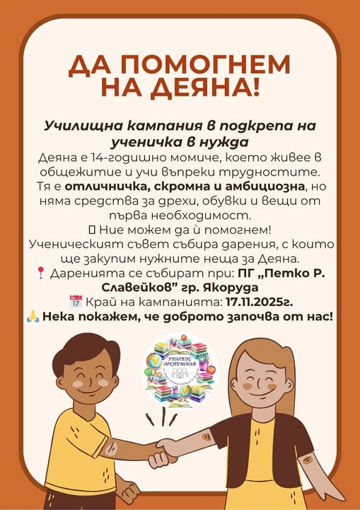 Благотворителна инициатива в подкрепа на 14-годишната Деяна организира ученическият съвет при ПГ “Петко Р. Славейков“ в Якоруда. Деяна е отличничка, но няма средства за дрехи, обувки и вещи от първа необходимост. Според информация от фондация “Спаси човека”: “момичето е неглижирано от родители и роднини, успява да се запише на училище и да отиде в общежитие, но е без никакви средства”.