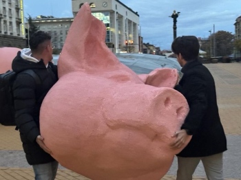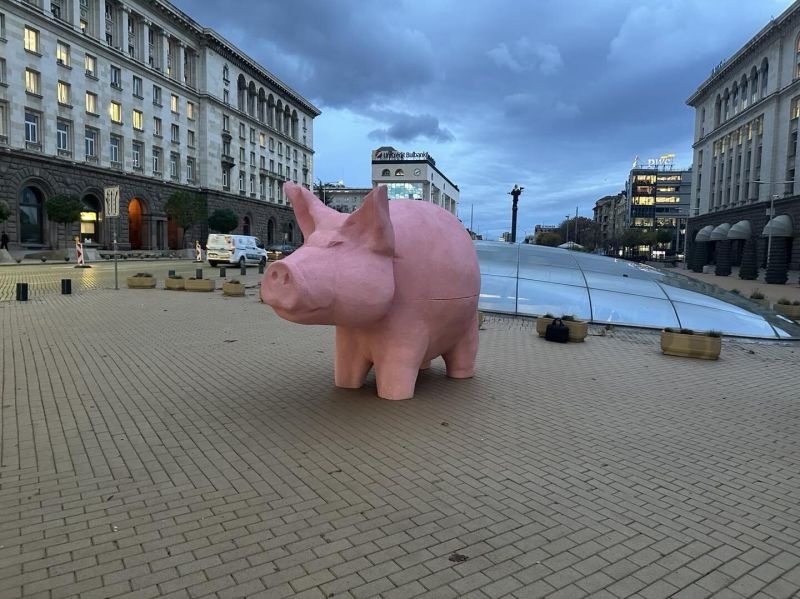 Младежи поставиха арт инсталация Прасе касичка в Триъгълника на властта в София. Поводът е разглеждането на проектобюджета за 2026 г., става ясно от фейсбук публикация на Продължаваме промяната.