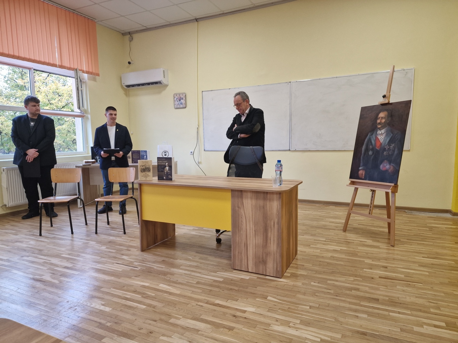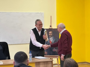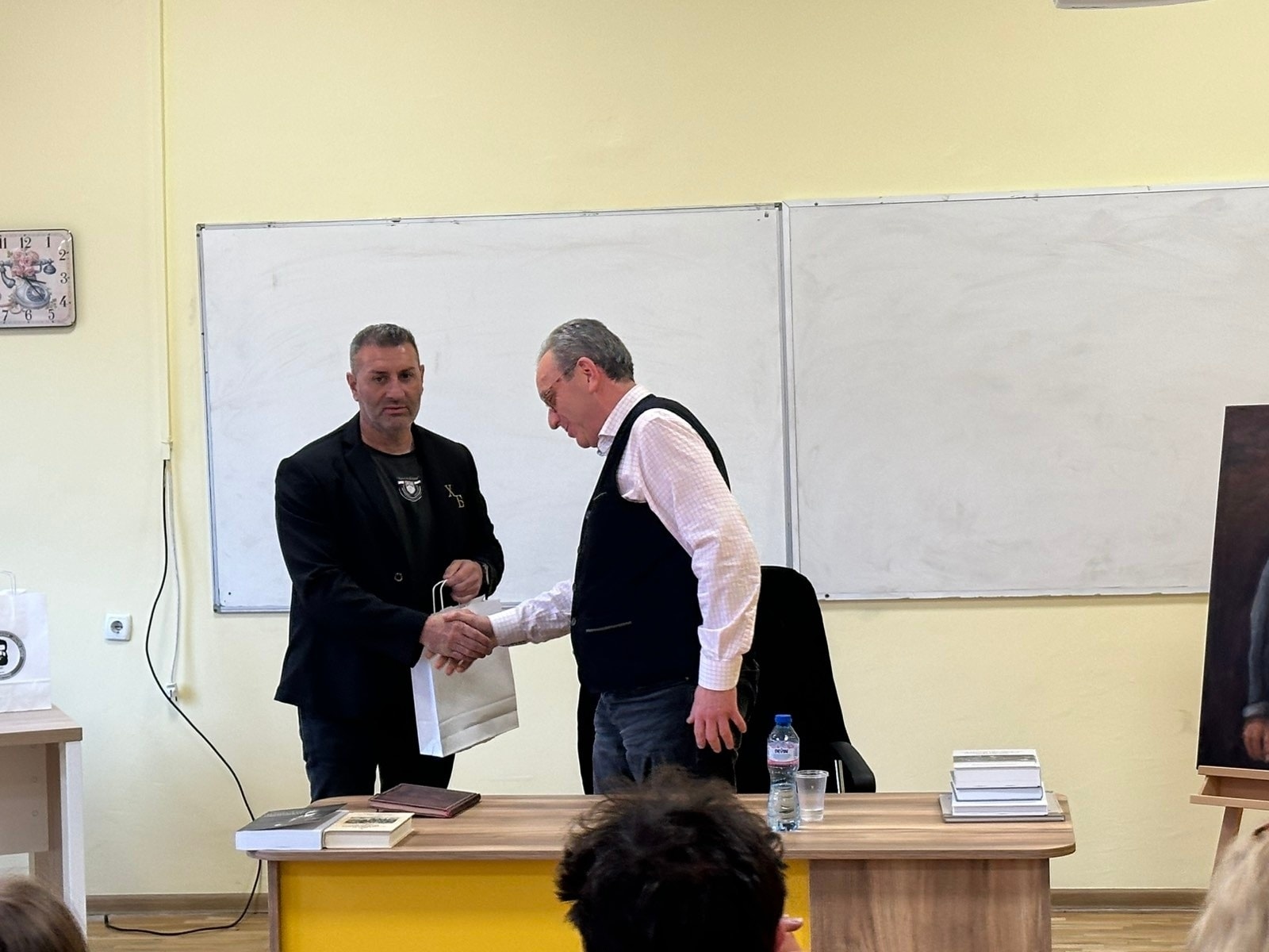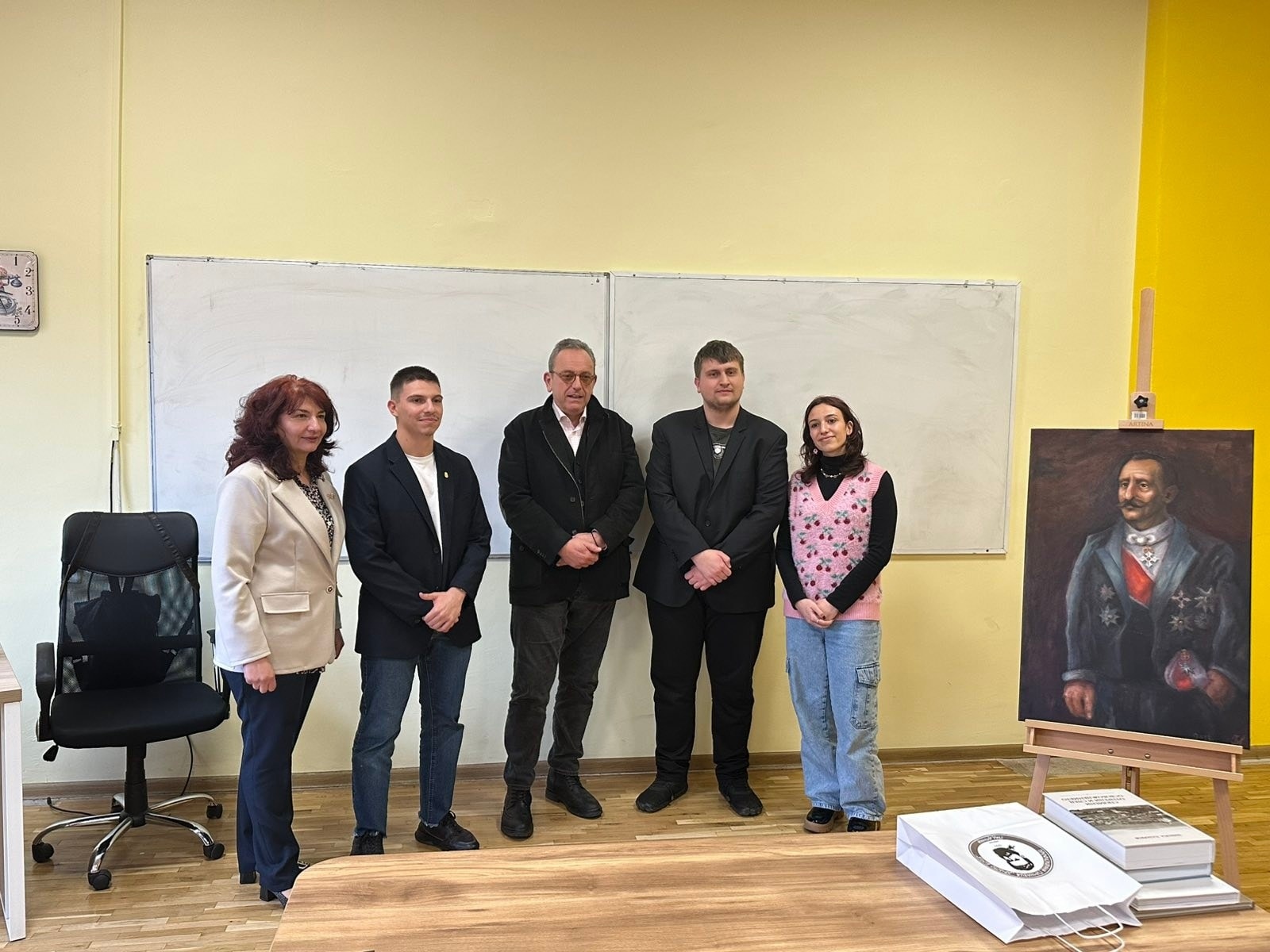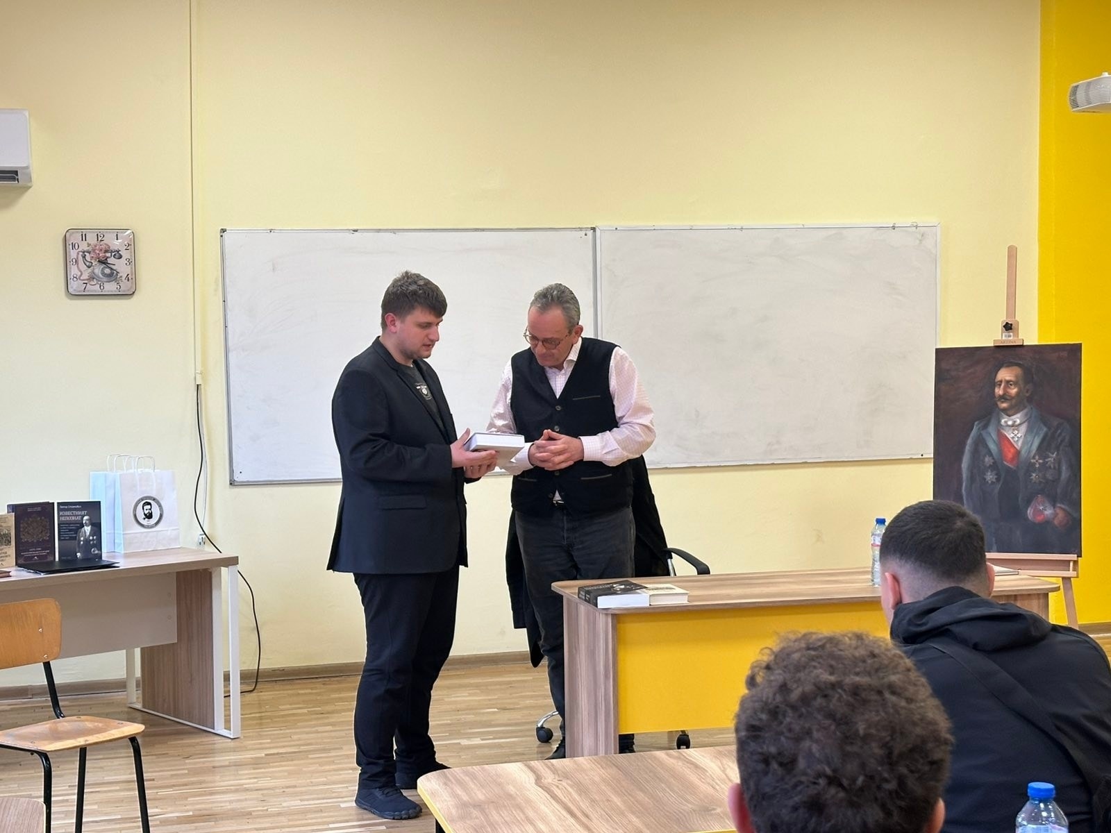 Вълнуващата среща не премина без изненади за госта.Професорът получи благодарности и подаръци, като най-впечатляващ бе портрет на неговия прадядо Иван Стоянович- Аджелето, нарисуван с изключително майсторство от Карина Спасова, ученичка от 12 “в” клас.