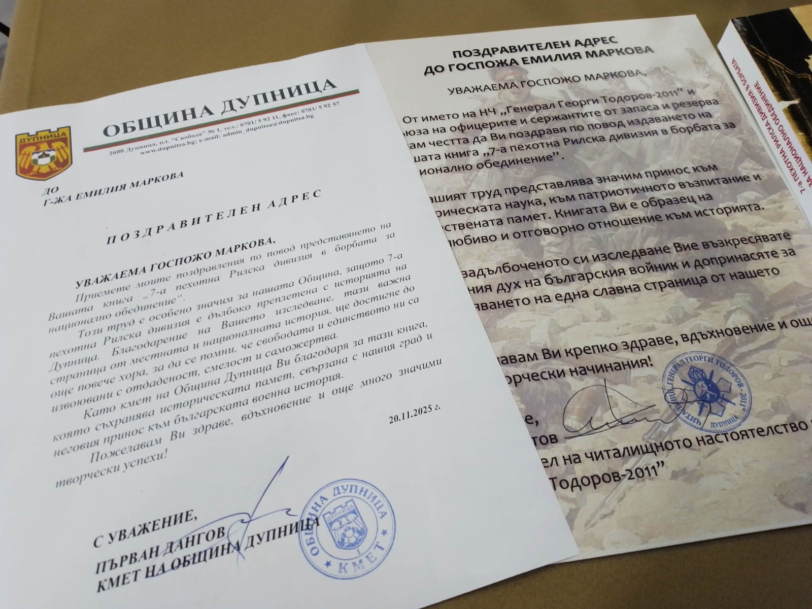 И при представянето на изданието авторката подчерта ролята на военното формирование за Дупница. “Дивизията се превръща в най-значимата институция в града. Мобилизираните тръгват на война като на сватба“, подчерта авторката. И допълни: “Заслужава да се отбележи и вдъхновението и родолюбието на населението от Дупница и района. 7-а пехотна рилска дивизия, чието седалище е Дупница, преобразява града в средище на решителна материална и морална подкрепа в борбата за освобождение и обединение и вече освободените хора – в освободители“.
