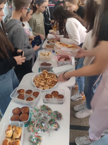 Учениците проведоха кулинарен конкурс – базар на курабийки и други лакомства. Макар и с конкурсен характер, базарът накара всички дружно да впрегнат сили в общата кауза - набирането на средства за бебе Карина.