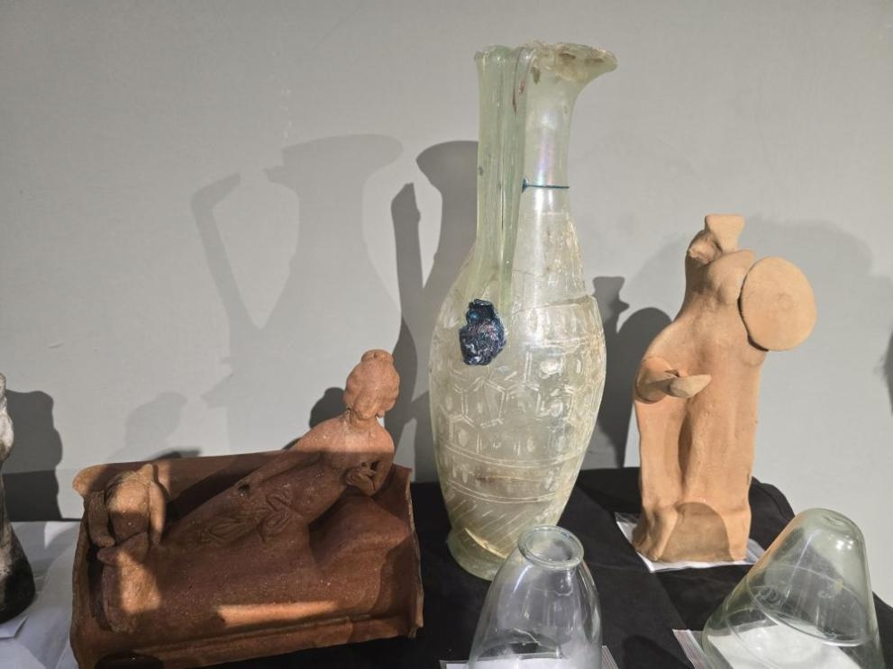 Сред най-впечатляващите експонати е и стъклена лампа с изображение на лъв върху нея. Сред експонатите освен от Римската императорска епоха, основно I-ви, II-ри, III-ти век, имаме и по-ранни от елинистическата епоха, основно от периода III-I век преди Христа. Учените са открили и рядка бронзова лампа. Металът и монетите са били почистени от Любомира Китанова от Регионалния исторически музей в Благоевград. Основните консерватори, работили с артефактите, са Дана Златанова и Цветина Дочева от Националния исторически музей, Ренета Караманова и д-р Китан Китанов от Национален археологически институт с музей - БАН. .jpg)