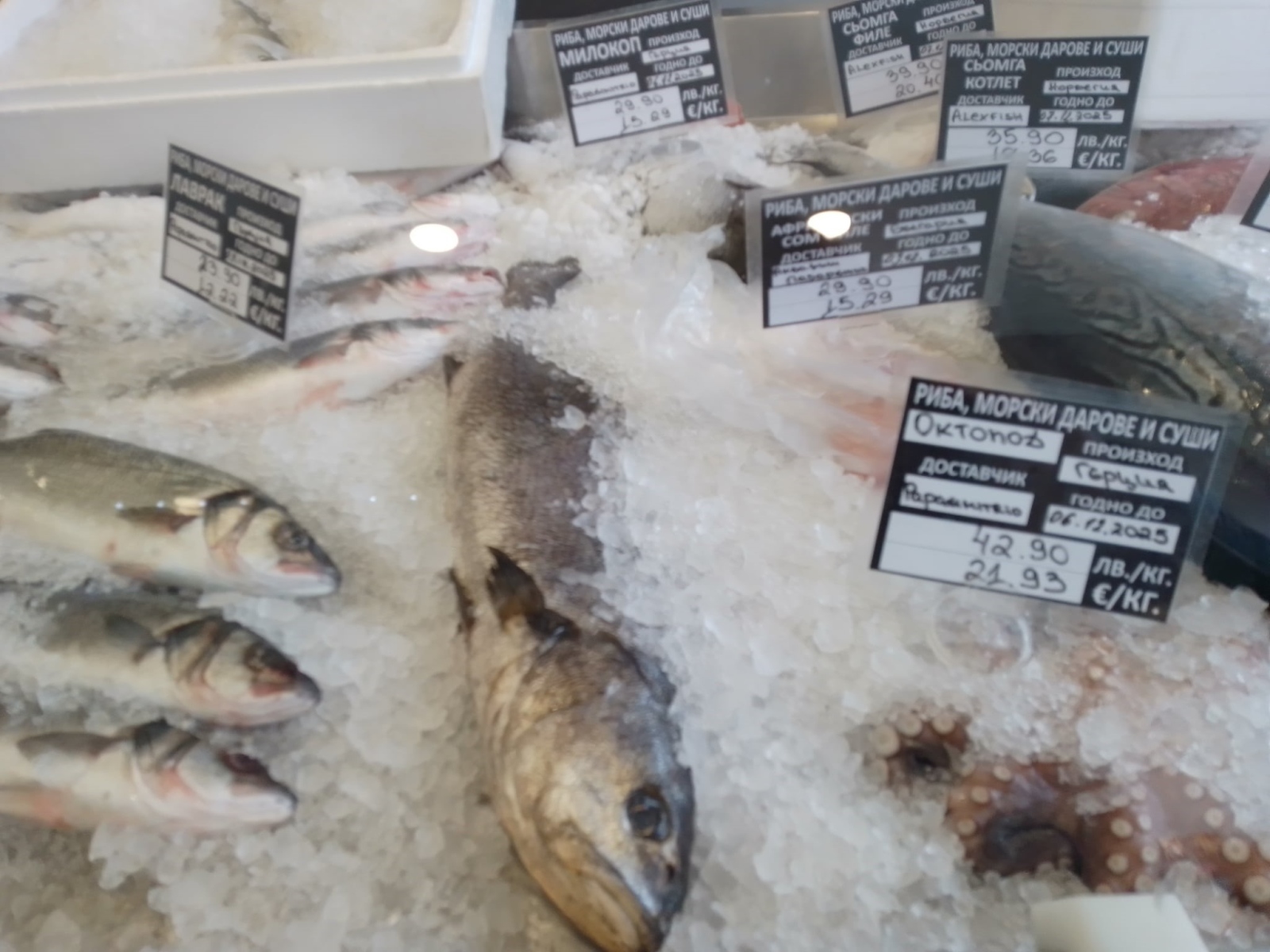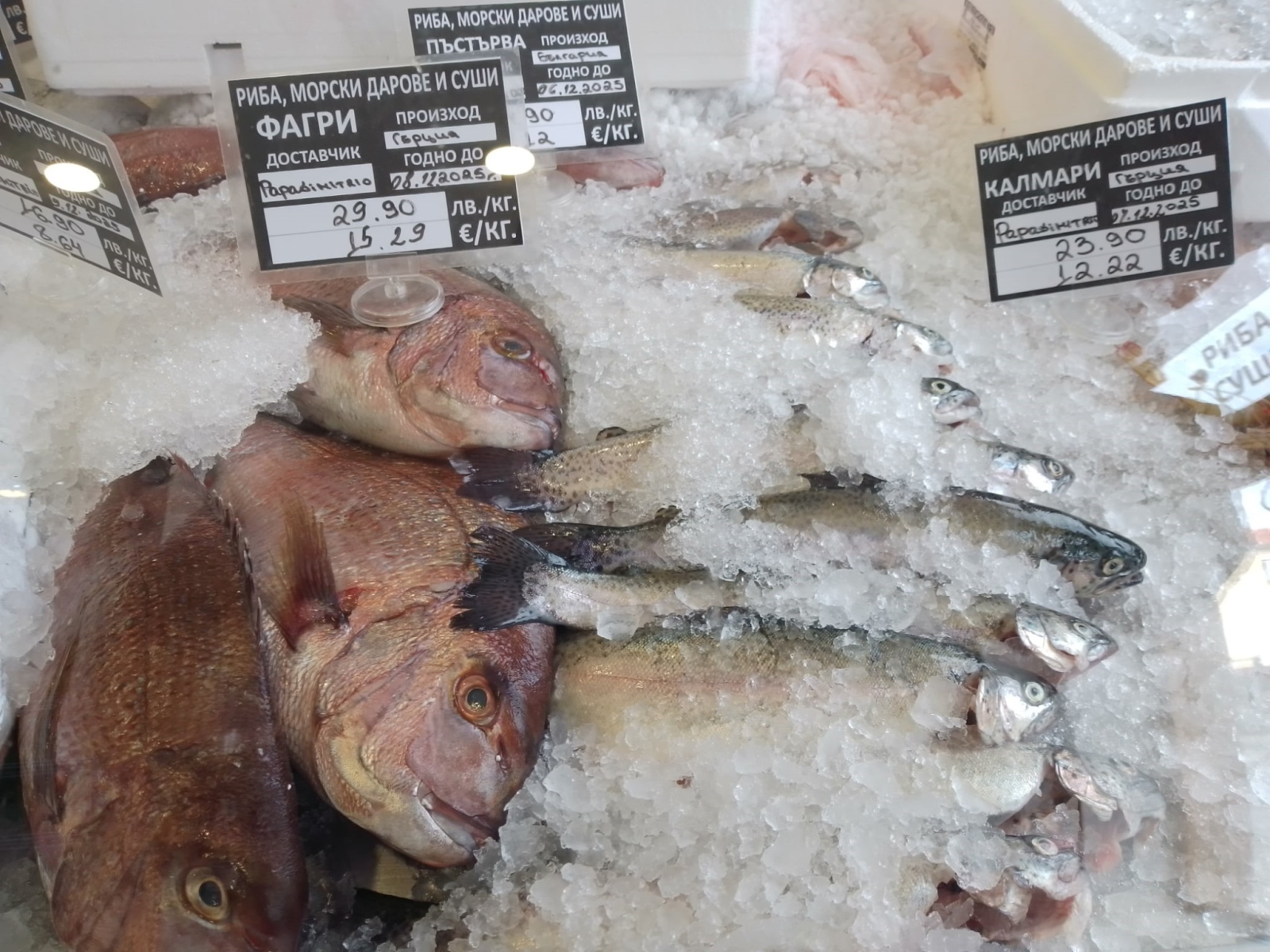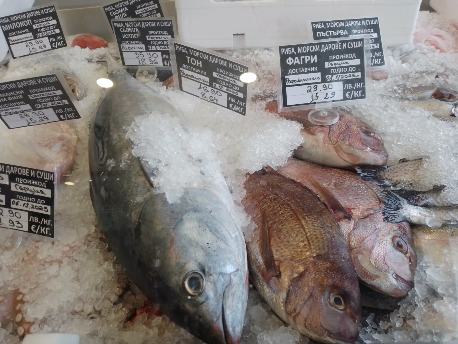 В същия магазин пъстървата се предлага по 14, 90 лв. за килограм. Кило риба тон е 16, 90 лв. Лавракът и ципурата, които напоследък все по-сериозно настъпват на българския пазар, са по 23, 90 килото. Килограм фагри и милокоп е 29, 90 лв.