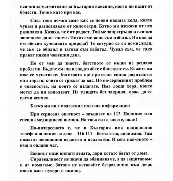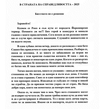 “Роко“ се изгубил, уплашил се, търсил дома си… и стига до извода: “Но от мен да знаете, бягството от къщи не решава проблеми. Бъдете смели и споделяйте с близките си. Кажете им как се чувствате…На улицата без закрила може да се случи всичко.“.