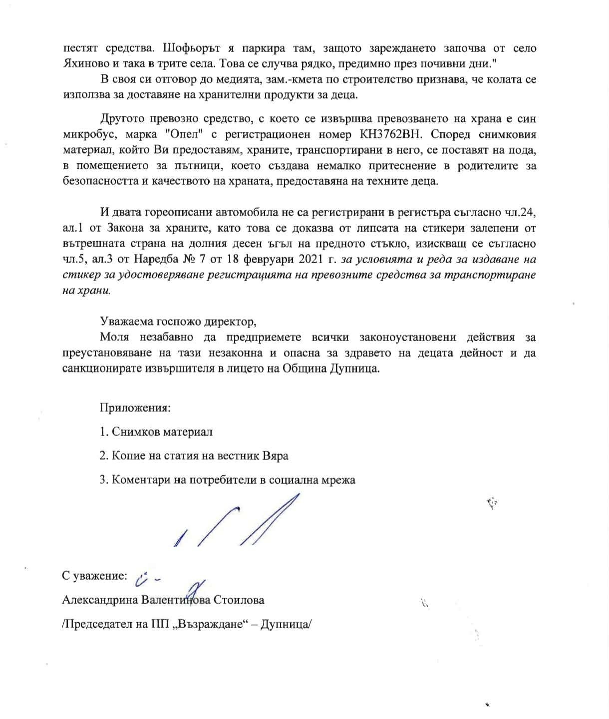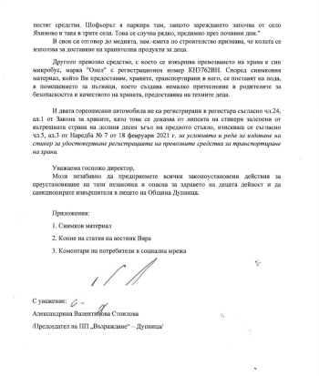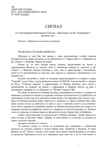 Сигнал до Областната дирекция по безопасност на храните (ОБДХ ), свързан с доставката и безопасността при снабдяването с хранителни продукти във филиалите на ДГ “Радост” в селата Яхиново, Червен брег и Крайници, внесе председателят на “Възраждане” в Дупница Александрина Стоилова.