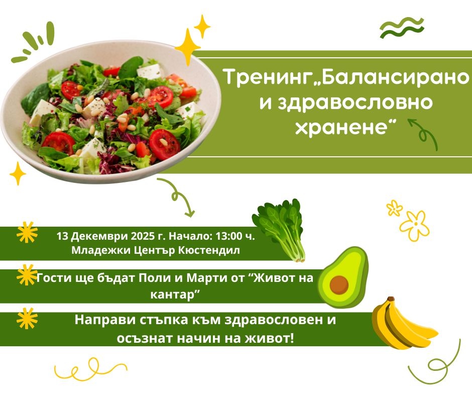 Същия ден, от 13:00 часа, ще се проведе обучителен тренинг на тема “Балансирано и здравословно хранене“. Сдружение “Балкани без граници“ и Младежки център Кюстендил канят младежите да се включат в инициативата, която е част от проект “Знаещи, информирани, здрави – промяната започва с една крачка!“. Специални гости ще бъдат Поли и Марти – популярни личности от “Живот на кантар“, които ще споделят личен опит и практични съвети за здравословен начин на живот.