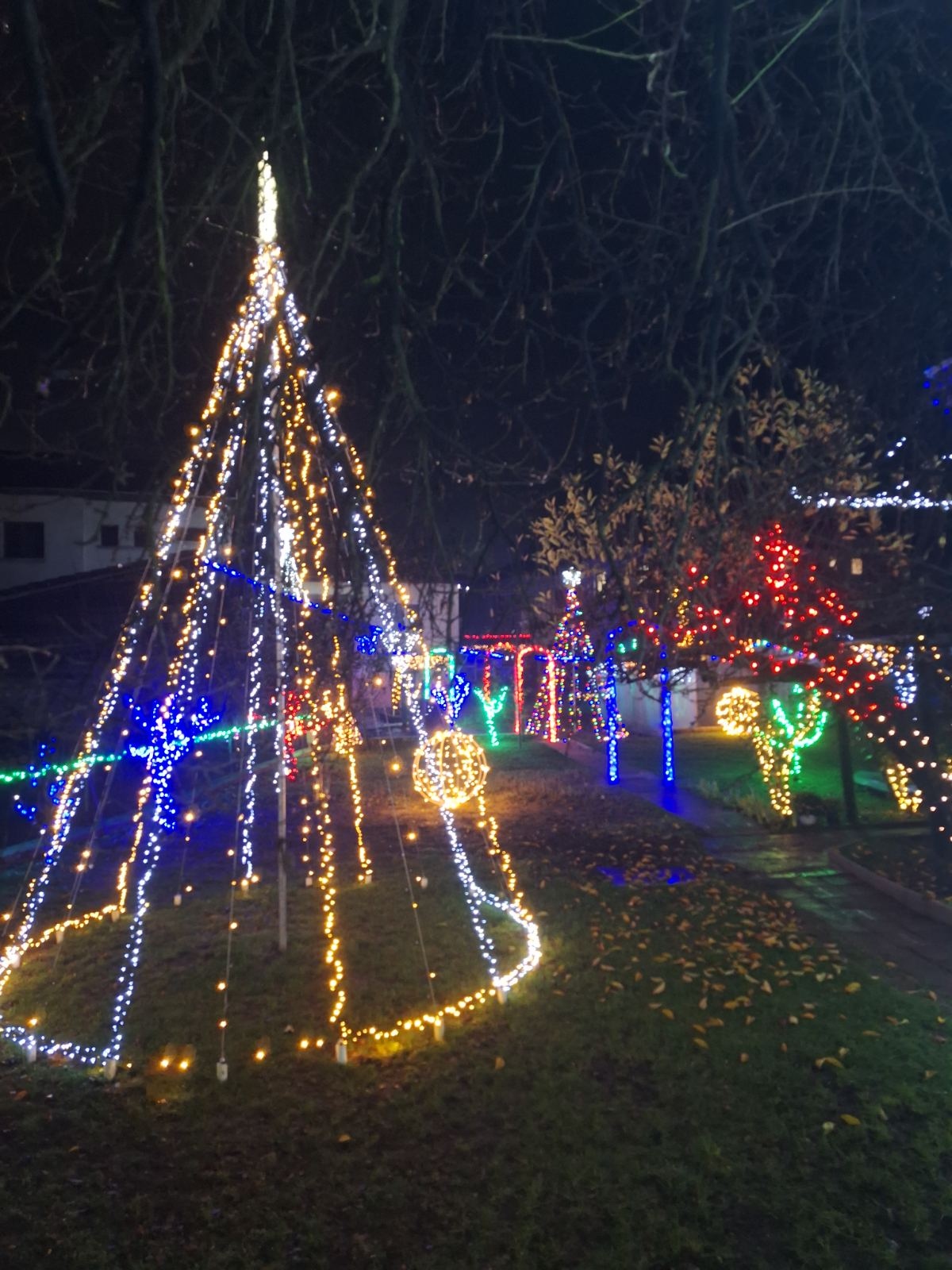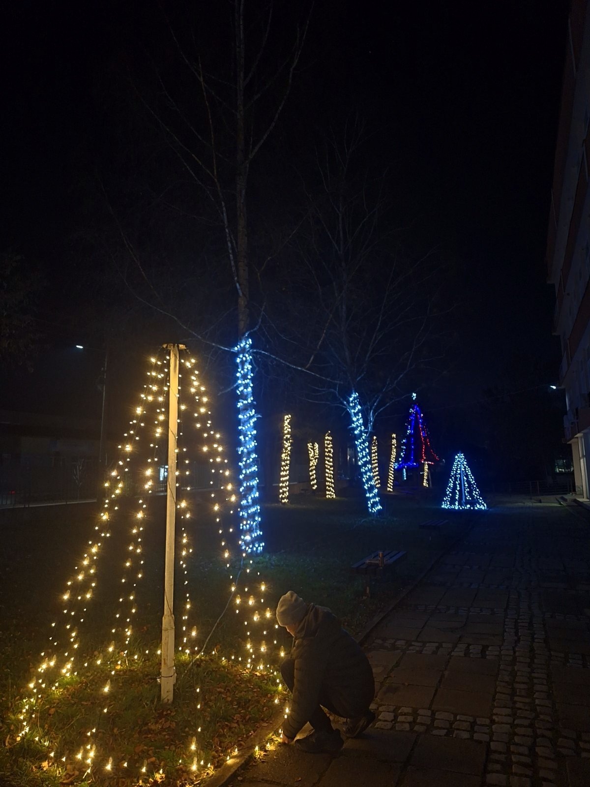 Там той е създал впечатляваща празнична украса, включваща 7–8 метрова елха, няколко по-малки елхи и допълнителни светещи мрежи, които превръщат училищния двор в място на празнична магия.