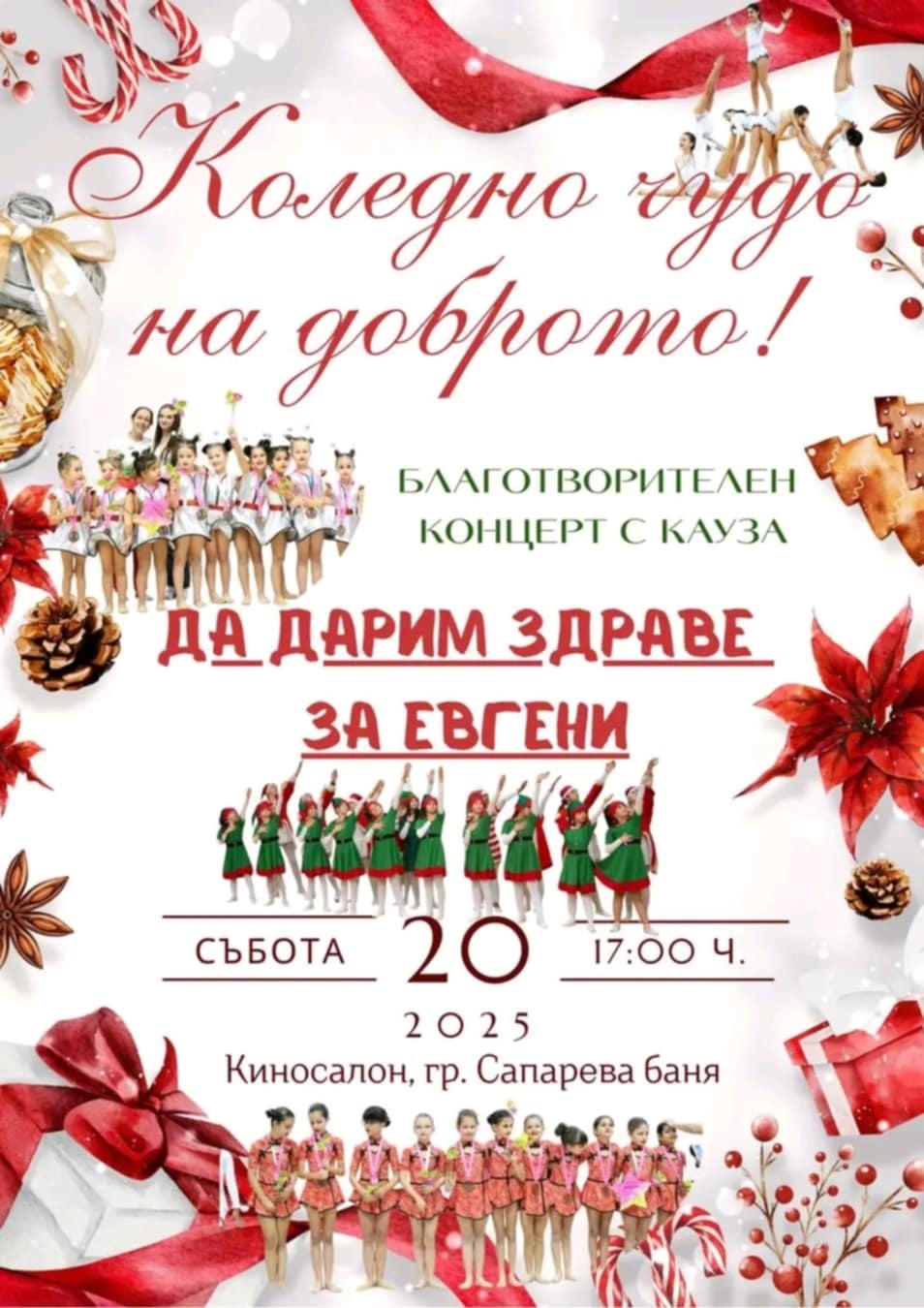 В този момент Сапарева баня отговаря с голямо сърце. На 20 декември, събота, от 17:00 часа в киносалона на града ще се проведе благотворителен концерт с кауза “Да дарим здраве за Евгени“. Организатор на концерта е Силвия Мутавчиева и нейните момичета от Boot Camp. Те споделиха, че вярват в силата на добротата и в чудесата, които се случват по Коледа.