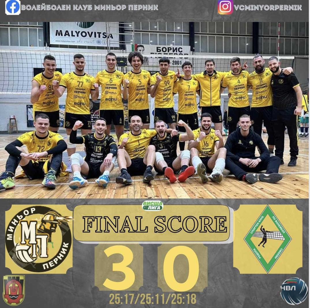 Добри новини за отбора дойдоха и от мъжката формация след като отборът и при мъжете се завърна на победния път. Жълто-черните постигнаха категорична победа с 3:0, с която приключват успешно есенния полусезон. “Благодарности на публиката, присъстваща в залата”, допълниха от волейболния Миньор.