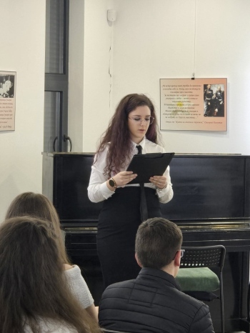 Виктория Илиева от 11. В клас разгърна философския диапазон на “Молитва“ от Атанас Далчев. Чрез стиховете на поета философ бяха откроени вечните екзистенциални въпроси за раздвоението на човешкото съществуване между стремежа към интелектуално познание и необходимостта да се живее просто и истински.