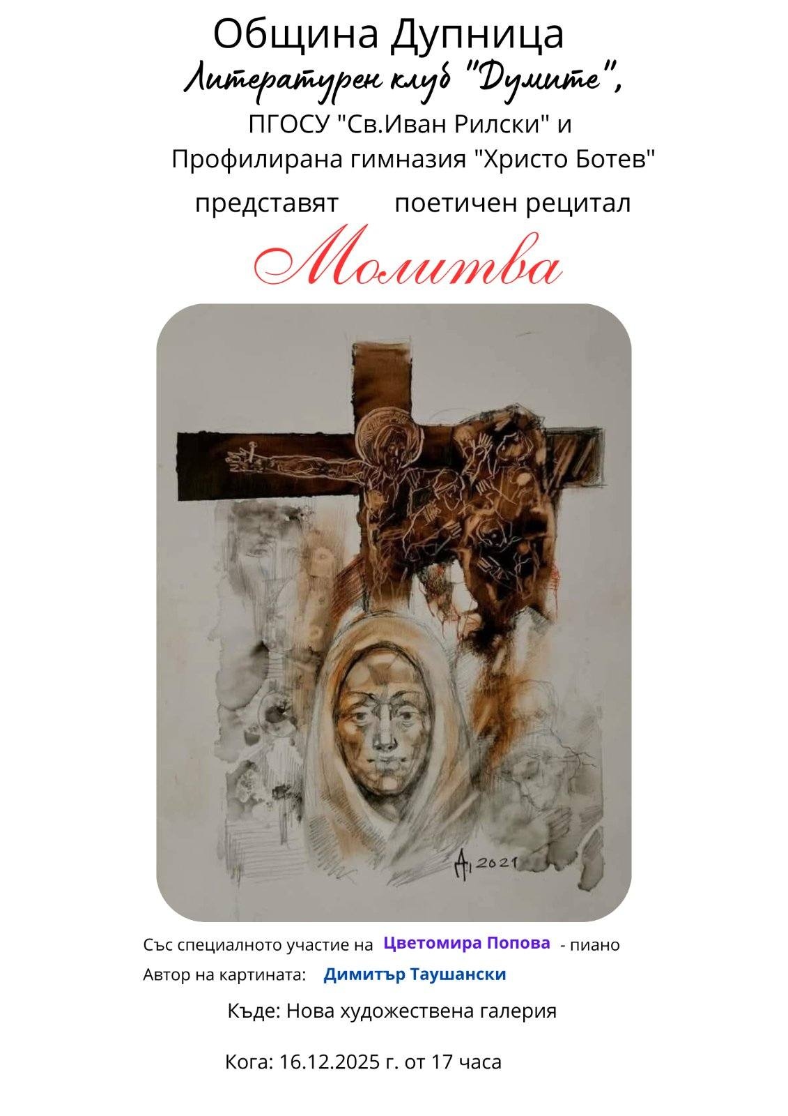 Прекрасно културно събитие се състоя в новата общинска художествена галерия в Дупница. То бе организирано от Профилираната гимназия “Христо Ботев“ и литературния клуб “Думите“ към ПГОСУ “Св. Иван Рилски“ в града.