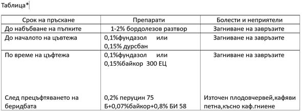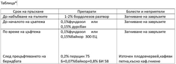 Във връзка с растителната защита предлагам да се ползва следната таблица* за комбинирано третиране с най-подходящите фунгициди и инсектициди. Длъжен съм да ви уведомя, че ежегодно на пазара се появяват нови химически препарати. Това се налага, тъй като продължителната употреба на един и същи продукт може да доведе до резистентност на гъбите, бактериите и неприятелите към препаратите, които са използвани многократно. Затова винаги търсете актуални препарати в селскостопанските аптеки. Табличката за борба с болестите и неприятелите съм изготвил във връзка с най-уязвимите периоди в развитието на болестите и неприятелите по дюлата. Дюлата е овощен вид, потребен за всяко семейство, защото изисква малко грижи за отглеждането й, а потребителските и лечебни свойства особено през зимния период налагат найното търсене”, пише 90-годишният агроном Милчо Спиров.