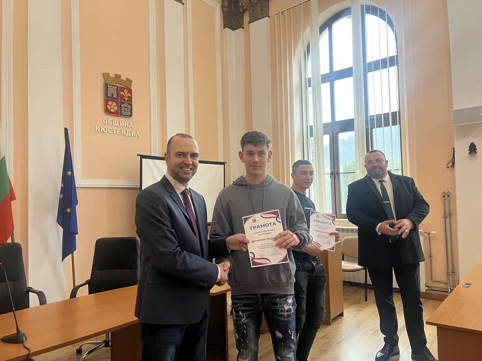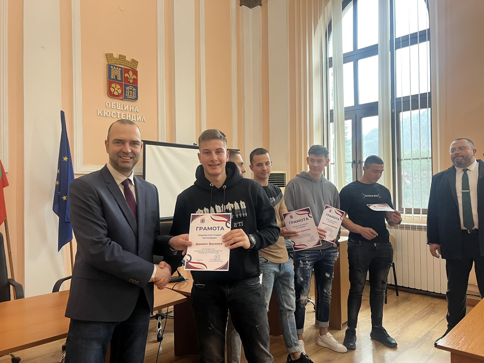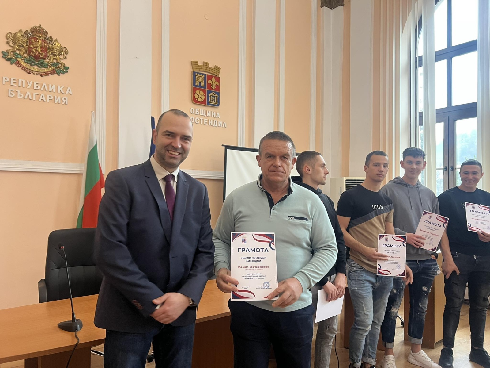 Кметът на Община Кюстендил инж. Огнян Атанасов заедно с председателя на Общинския съвет Димитър Велинов отличиха младите доброволци, които се проявиха с изключителни умения на националните състезания по повод Българския ден на доброволеца за защита при бедствия.