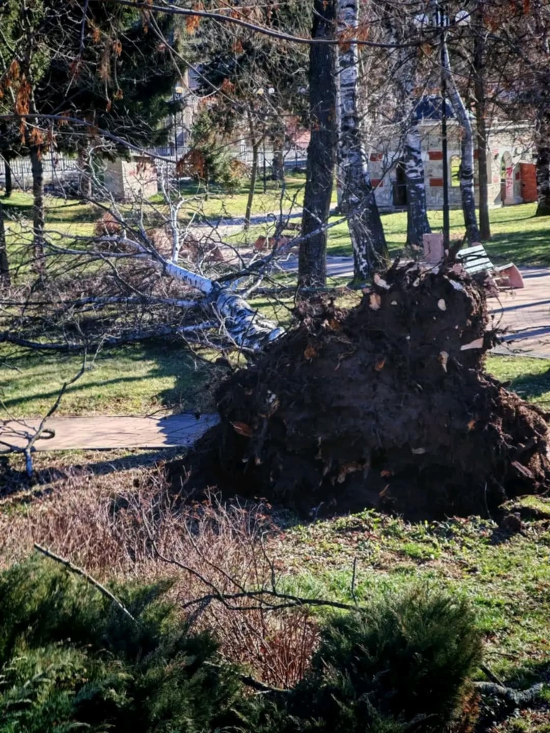 Поради силният вятър има паднали дървета в градинката при паметника на Иван Козарев в Добринище. "Обстановката е критична, моля избягвайте района около парка и въпросната градинка", обявиха от кметство. Местни жители алармираха и за липсата на ток.