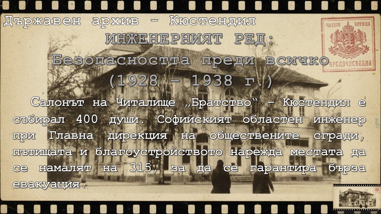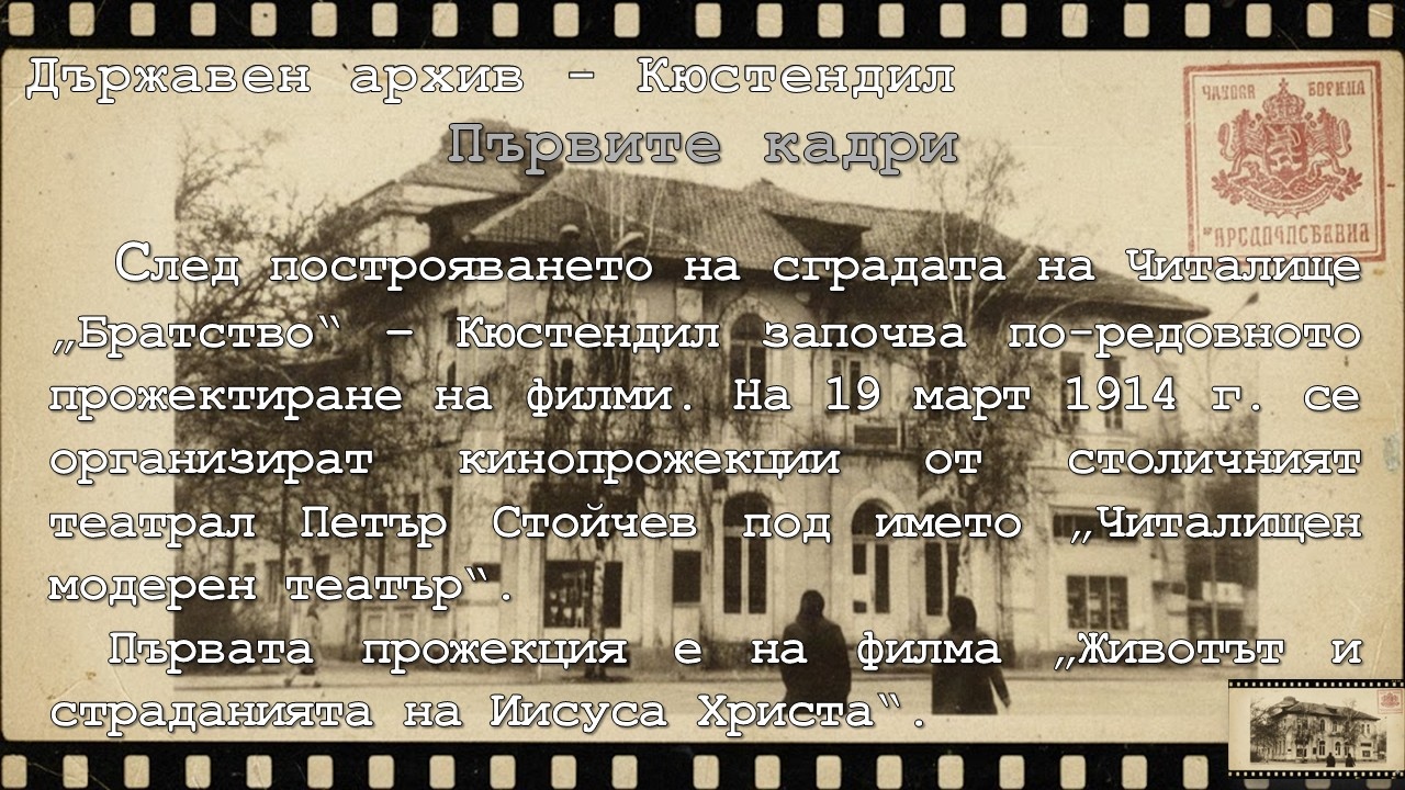 Държавният архив в Кюстендил представя дигитална фотоизложба с виртуална разходка из “кухнята“ на старото кино. Експозицията е базирана на документи от фонда на читалище “Братство“ – Кюстендил и киното, съхранявани в архива, съобщават от управата на архивите.