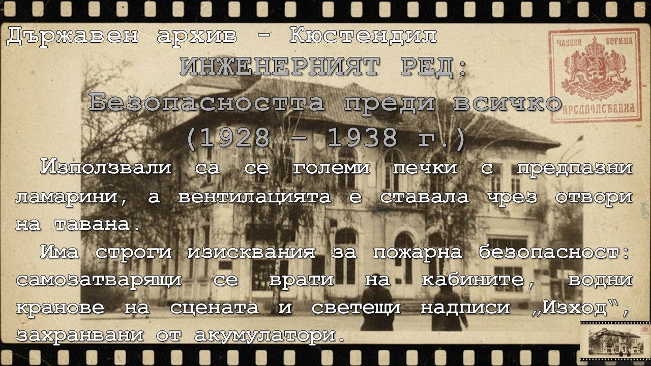 Архивите съдържат и сведения за строгите изисквания за пожарна безопасност – самозатварящи се врати на кабините, водни кранове на сцената и светещи надписи “изход“, захранвани от акумулатори.