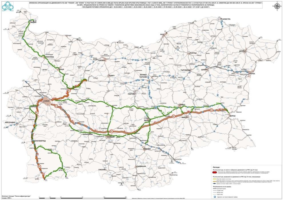 На интернет страницата на Агенция “Пътна инфраструктура“ е публикувана заповедта, която регламентира движението в определените празнични дни по “Тракия“, “Хемус“ - в участъка от София (км 0) до пътна връзка при кръгово кръстовище с път I-4 (87-ми км), “Струма“ и републикански път I-1 в отсечката от п. в. “Симитли“ (376-ти км) до п. в. “Кресна“ на АМ “Струма“ (402-ри км). В нея са посочени предстоящите ограничения за преминаване на тежкотоварните автомобили в определените дни и часове.