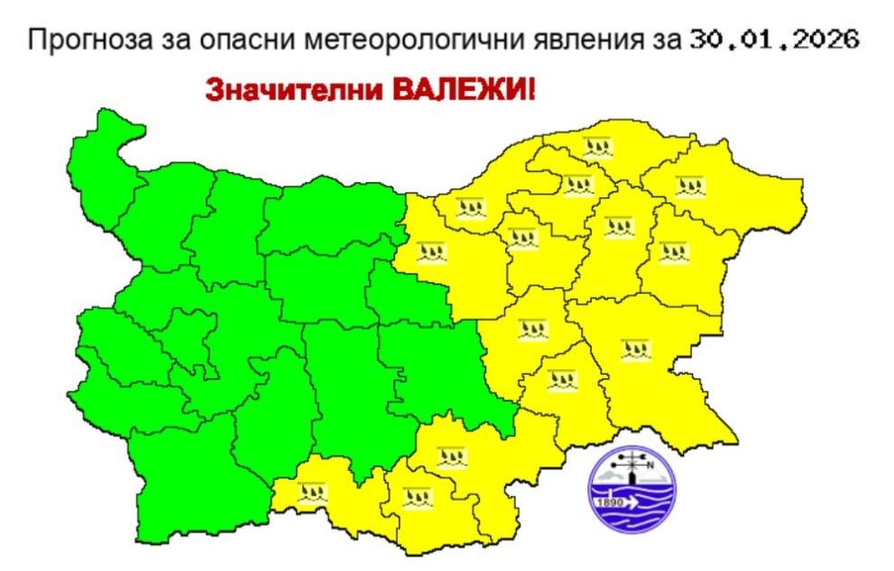 Жълт код за значителни валежи е обявен в 14 области. Очакват се валежи с количества от 10-20 mm, на места около и над 30 mm. Предупреждението за опасно време е в сила за областите Добрич, Варна, Бургас, Силистра, Русе, Велико Търново, Шумен, Сливен, Ямбол, Разград, Търговище, Хасково, Смолян и Кърджали.