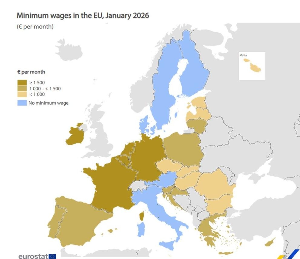 Според данни на Евростат към 1 януари 2026 г. 22 от 27 държави в ЕС имат национална минимална работна заплата. Изключение правят Дания, Италия, Австрия, Финландия и Швеция.
