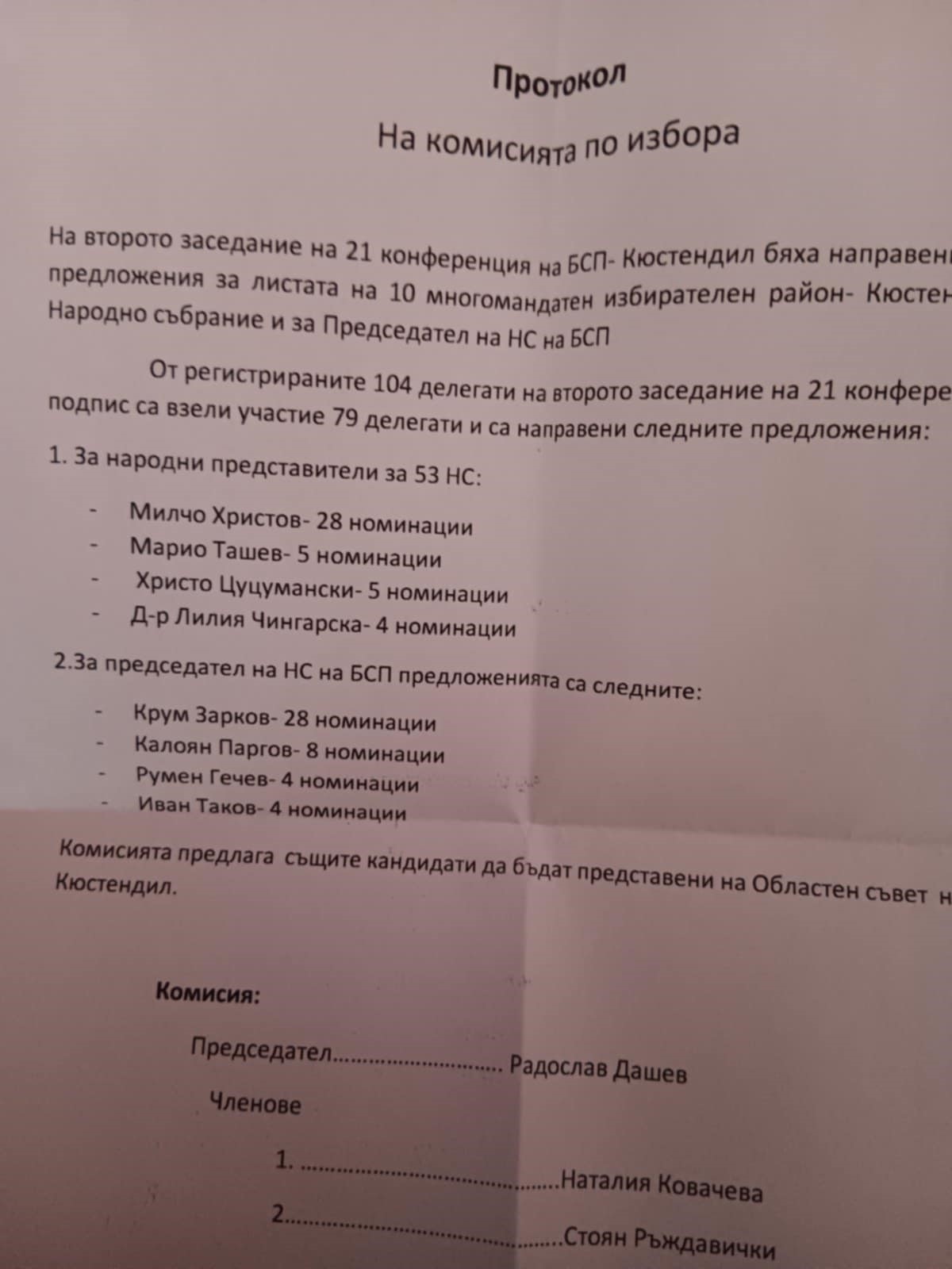 От регистрираните 104 делегати по подпис, участие в гласуването са взели 79. Най-много номинации за листата за бъдещо Народно събрание е получил председателят на Общинския съвет на БСП в Кюстендил Милчо Христов. За него са гласували 28 от делегатите .Марио Ташев и Христо Цуцумански са получили по 5 номинации, а д-р Лидия Чингарска е с 4.