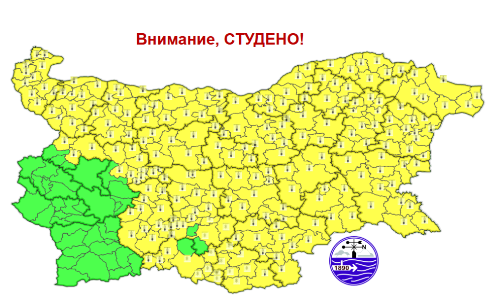 Предупреждението е за дневни температури под нулата и значителни снеговалежи. То е в сила за почти всички области в страната, без София град, Перник, Кюстендил и Благоевград (единствено там кодът е зелен).