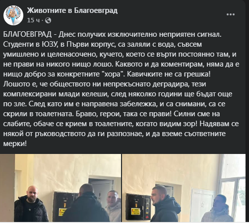 Публикацията във фейсбук страницата гласи: “Получих изключително неприятен сигнал. Студенти в ЮЗУ, в Първи корпус, са заляли с вода, съвсем умишлено и целенасочено, кучето, което се върти постоянно там, и не прави на никого нищо лошо. Каквото и да коментирам, няма да е нищо добро за конкретните "хора". Кавичките не са грешка! Лошото е, че обществото ни непрекъснато деградира.