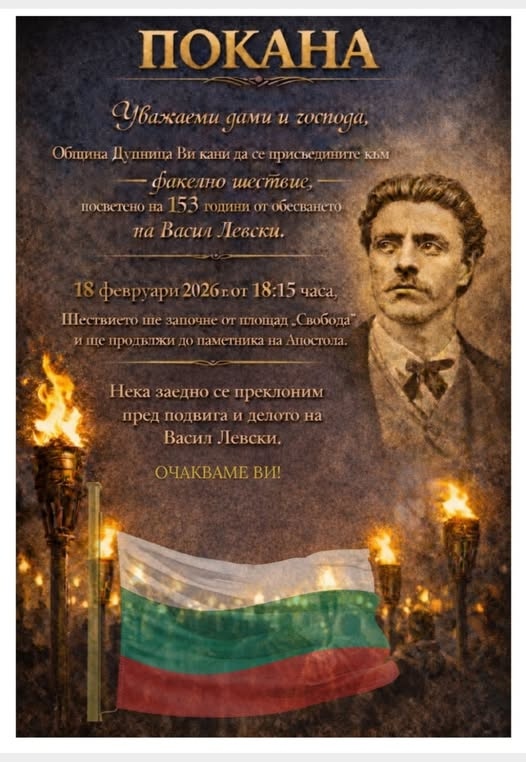 Факелно шествие, посветено на 153 години от обесването на Васил Левски, ще се състои в Дупница на 18 февруари, съобщиха от Общината.