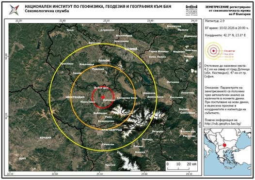 По данни на Националния Сеизмологичен Център към Национален Институт по Геофизика, Геодезия и География - БАН, на 10 февруари 2026 г., в 20:00 ч., бе регистрирано земетресение с магнитуд 2.9 в района на град Дупница, област Кюстендил