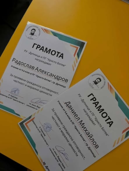 Учениците от ПГ “Христо Ботев” Радослав Александров, Даниел Михайлов и Симеон Георгиев намериха изгубен портфейл със значителна сума пари и незабавно го предадоха, за да бъде върнат на собственика му.