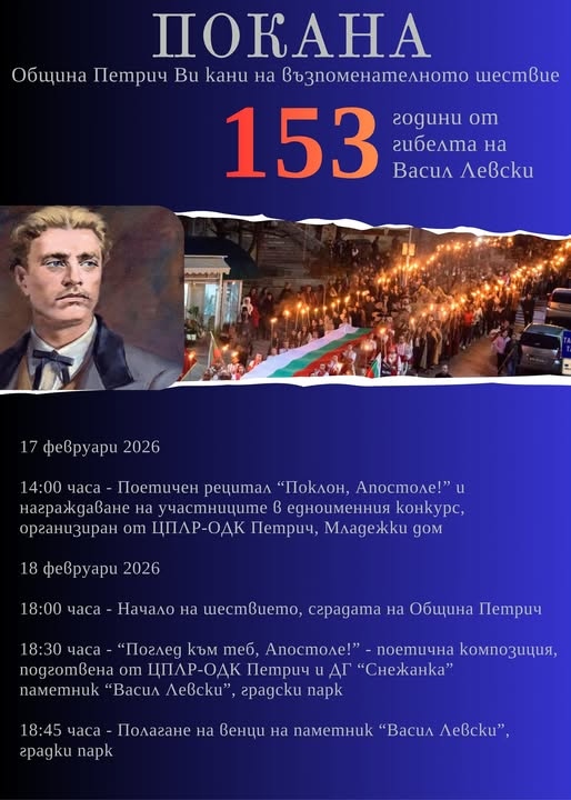 В Петрич ще бъде отбелязана 153-годишнината от обесването на Васил Левски с факелно шествие и поетичен рецитал, съобщават от местната администрация. Събитието се организира, за да почете подвига на националния герой и да изрази признателност към делото му.