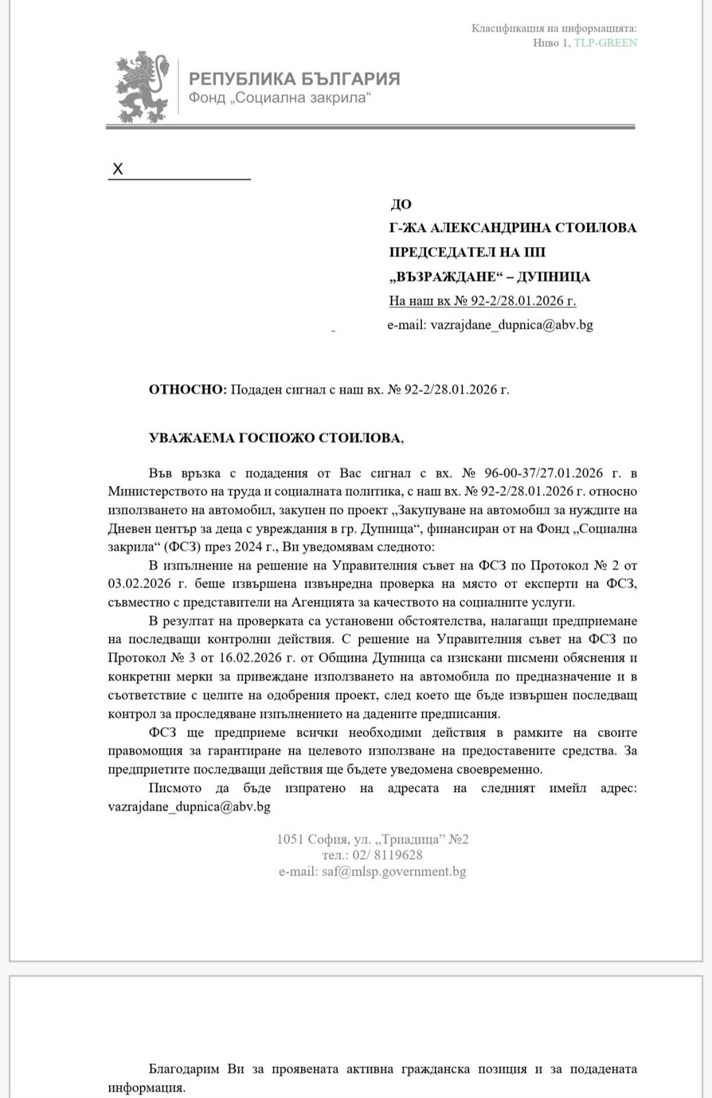 По тази причина, председателят на “Възраждане” в Дупница внесе нова порция сигнали към съответните ведомства.Стоилова настоя за проверка от Министерство на труда и социалната политика, както и Агенцията за държавна финансова инспекция, които да изяснят целесъобразността на разходваните държавни средства от Фонд “Социална закрила” .