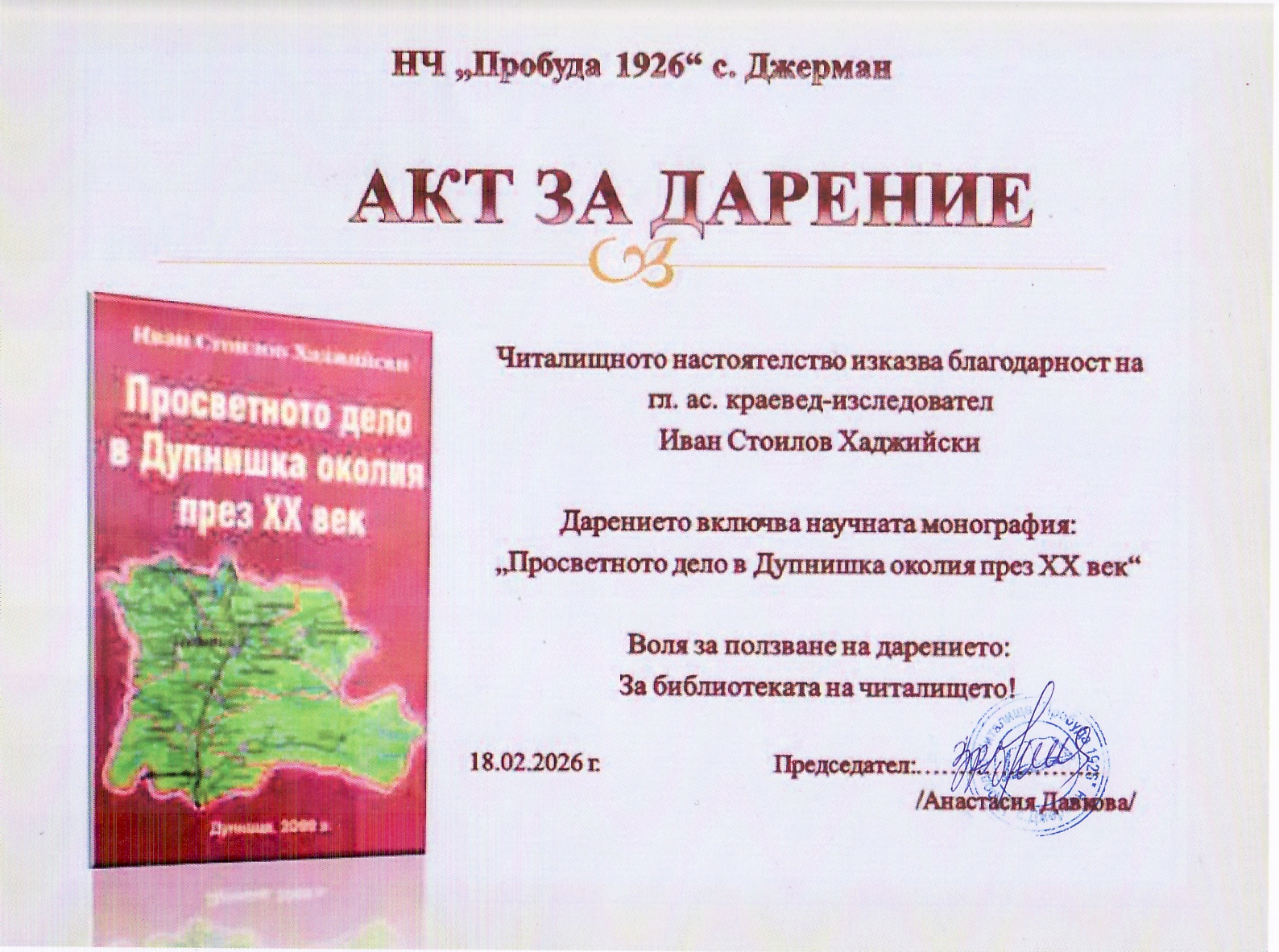 Изтъкнатият дупнишки краевед-изследовател гл.ас. Иван Хаджийски на 10 февруари 2026 г. (вторник) е направил дарение, включващо негова публикация на читалищните библитеки в община Дупница. Това списание е централно, научно и излиза от 1994 г. насетне.
