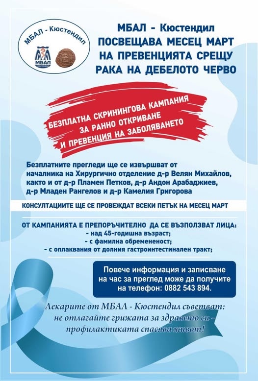 За първи път МБАЛ – Кюстендил посвещава месец март на борбата с колоректалния карцином, като организира безплатна скринингова кампания за ранно откриване и превенция на заболяването.Инициативата се провежда съвместно с отделението по “Хирургия“ към лечебното заведение и има за цел да повиши информираността и да насърчи профилактиката сред жителите на Кюстендил и региона.