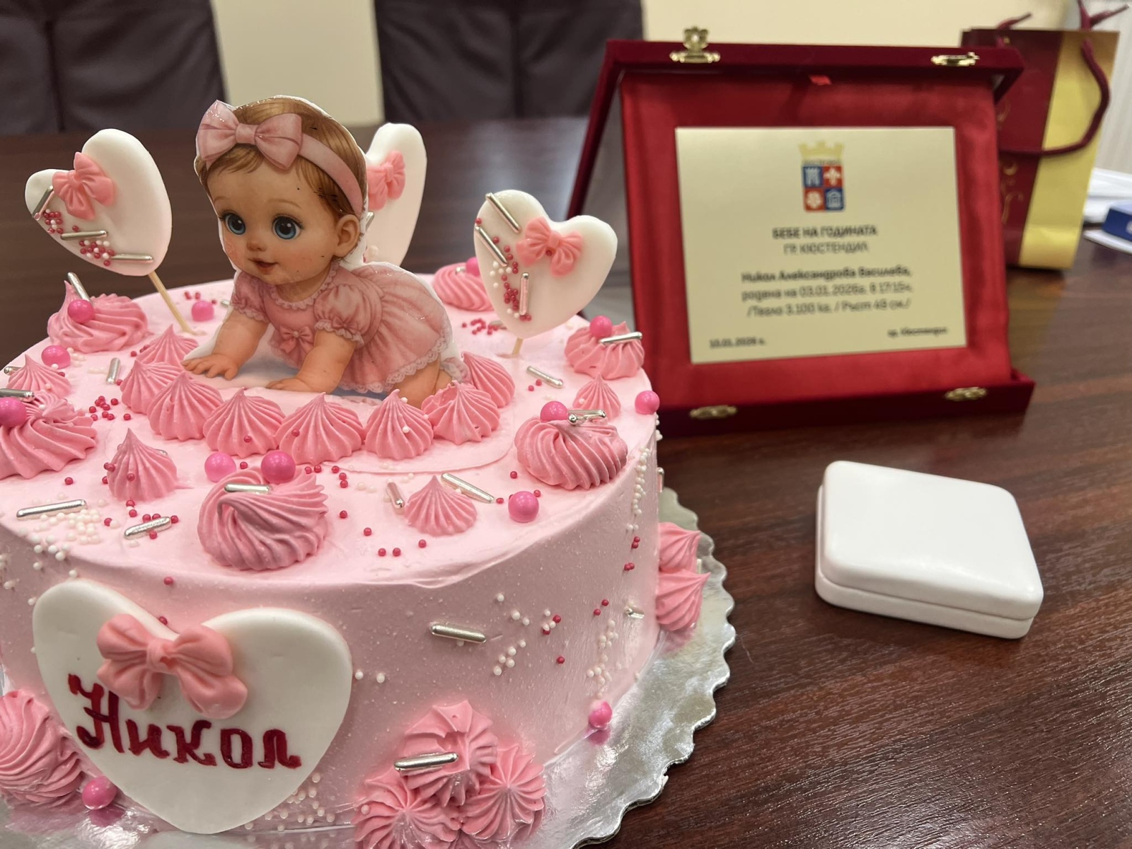 Кметът на Община Кюстендил, инж. Огнян Атанасов, награди “Бебе на годината“ за 2026 г. в града – малката Никол Александрова Василева, родена на 3 януари в 17:15 ч.