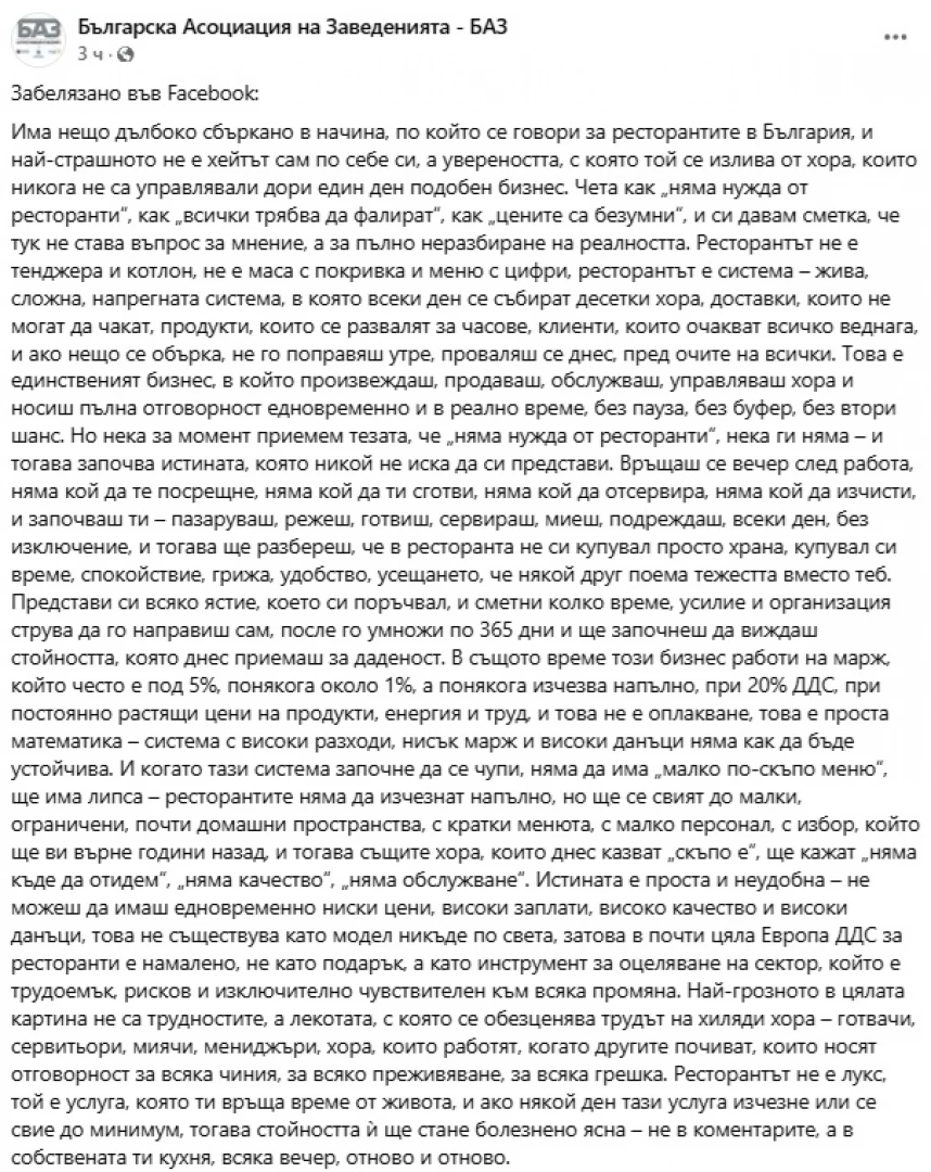 "Ресторантът не е тенджера и котлон, не е маса с покривка и меню с цифри, ресторантът е система – жива, сложна, напрегната система, в която всеки ден се събират десетки хора, доставки, които не могат да чакат, продукти, които се развалят за часове, клиенти, които очакват всичко веднага, и ако нещо се обърка, не го поправяш утре, проваляш се днес, пред очите на всички. Това е единственият бизнес, в който произвеждаш, продаваш, обслужваш, управляваш хора и носиш пълна отговорност едновременно и в реално време, без пауза, без буфер, без втори шанс", гласи мнението, споделено от БАЗ и СЗБ.