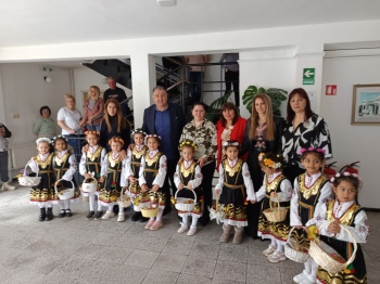 Облечени в народни носии, малките лазарки пресъздадоха обичая Лазаруване с песни и наричания за здраве и берекет. С изпълненията си те внесоха празнично настроение в сградата на общината и поздравиха администрацията.