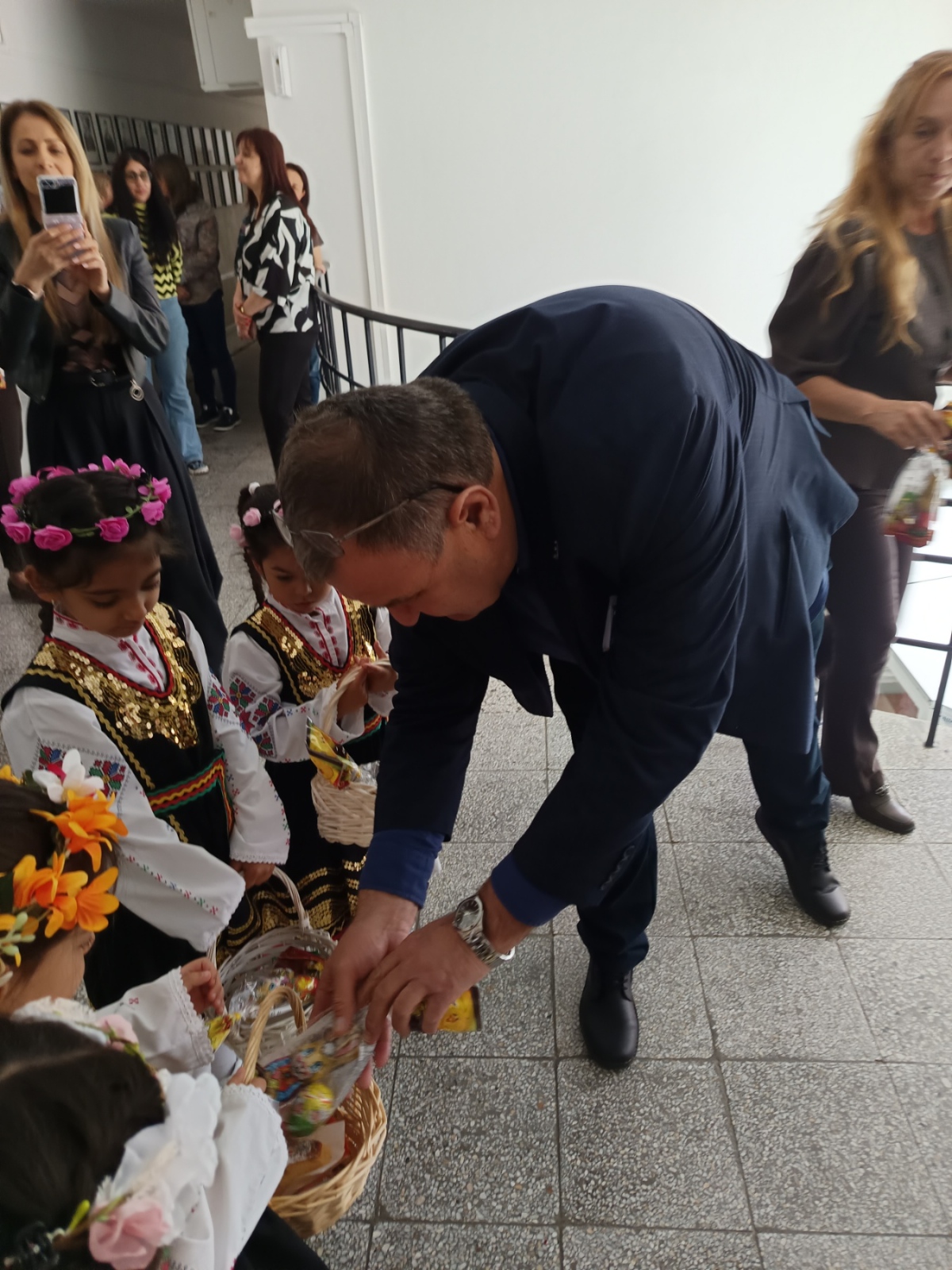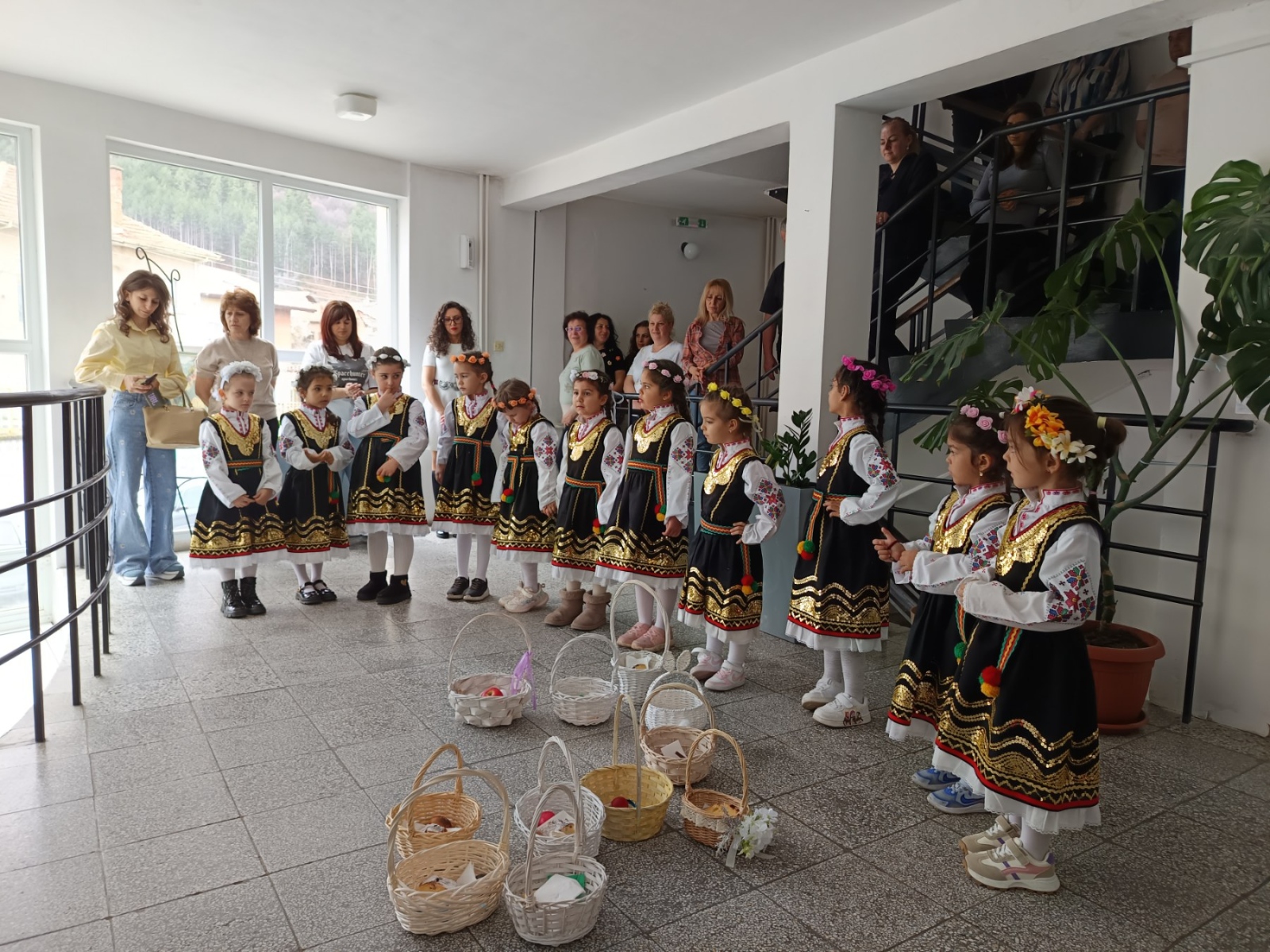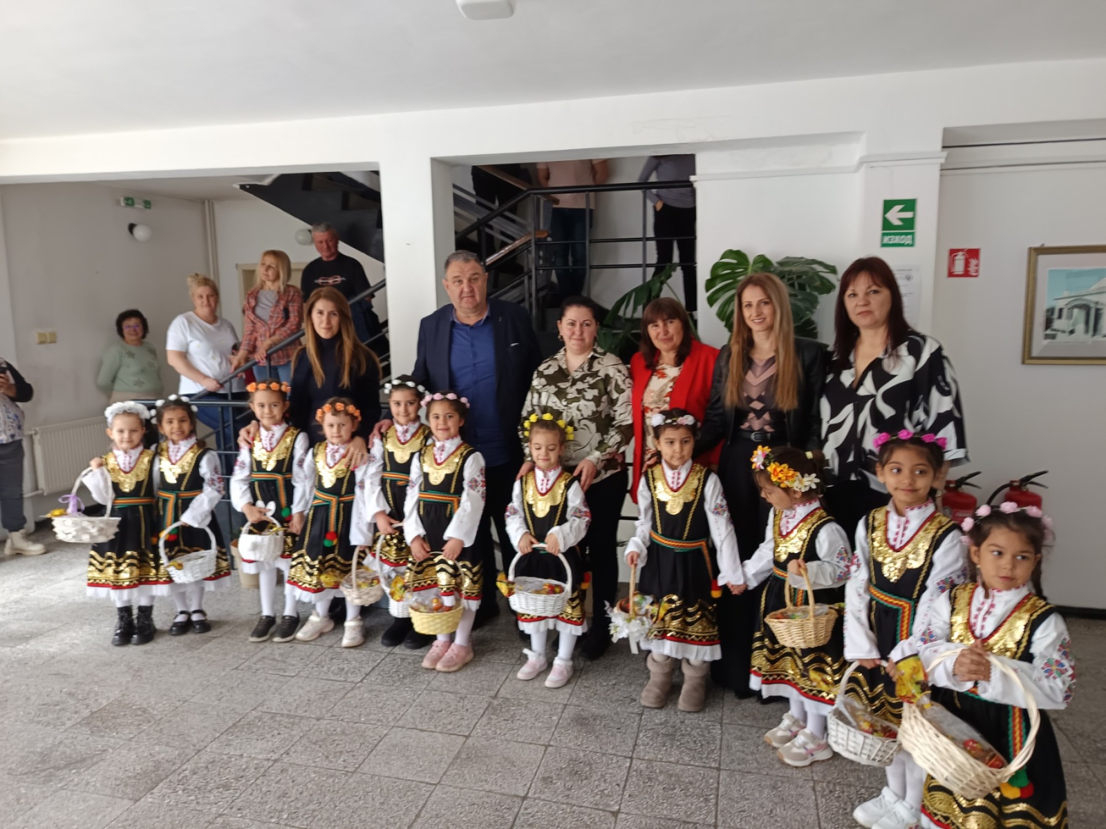 В навечерието на Великденските празници деца от Детска градина “Света Анна“ посетиха община Сапарева баня и поздравиха кмета Калин Гелев.