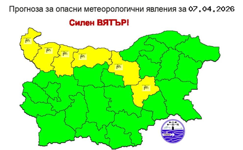 Жълт код за силен вятър с пориви до 24 m/s е обявен в 6 области. Това са Сливен, Велико Търново, Плевен, Враца, Монтана и Видин.